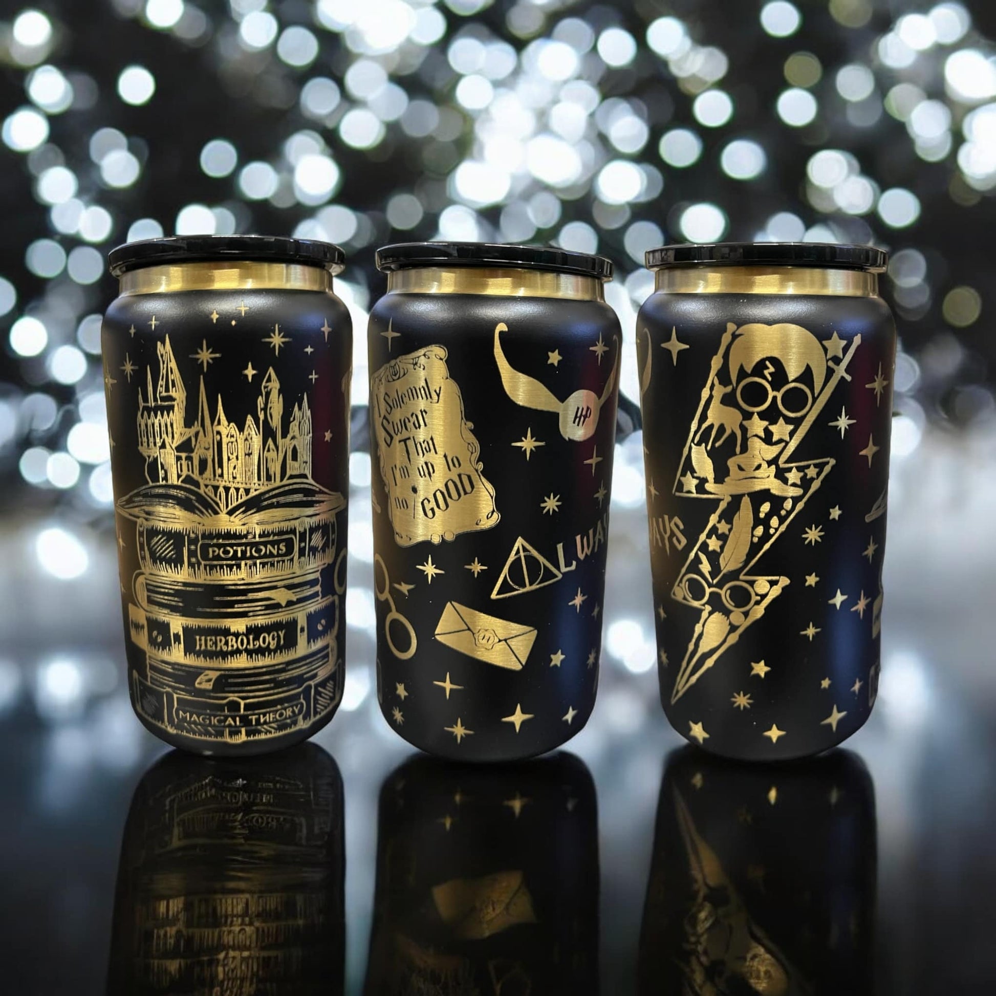 16 oz steel with plastic lid. Gold underbase for a beautiful custom engraved design.