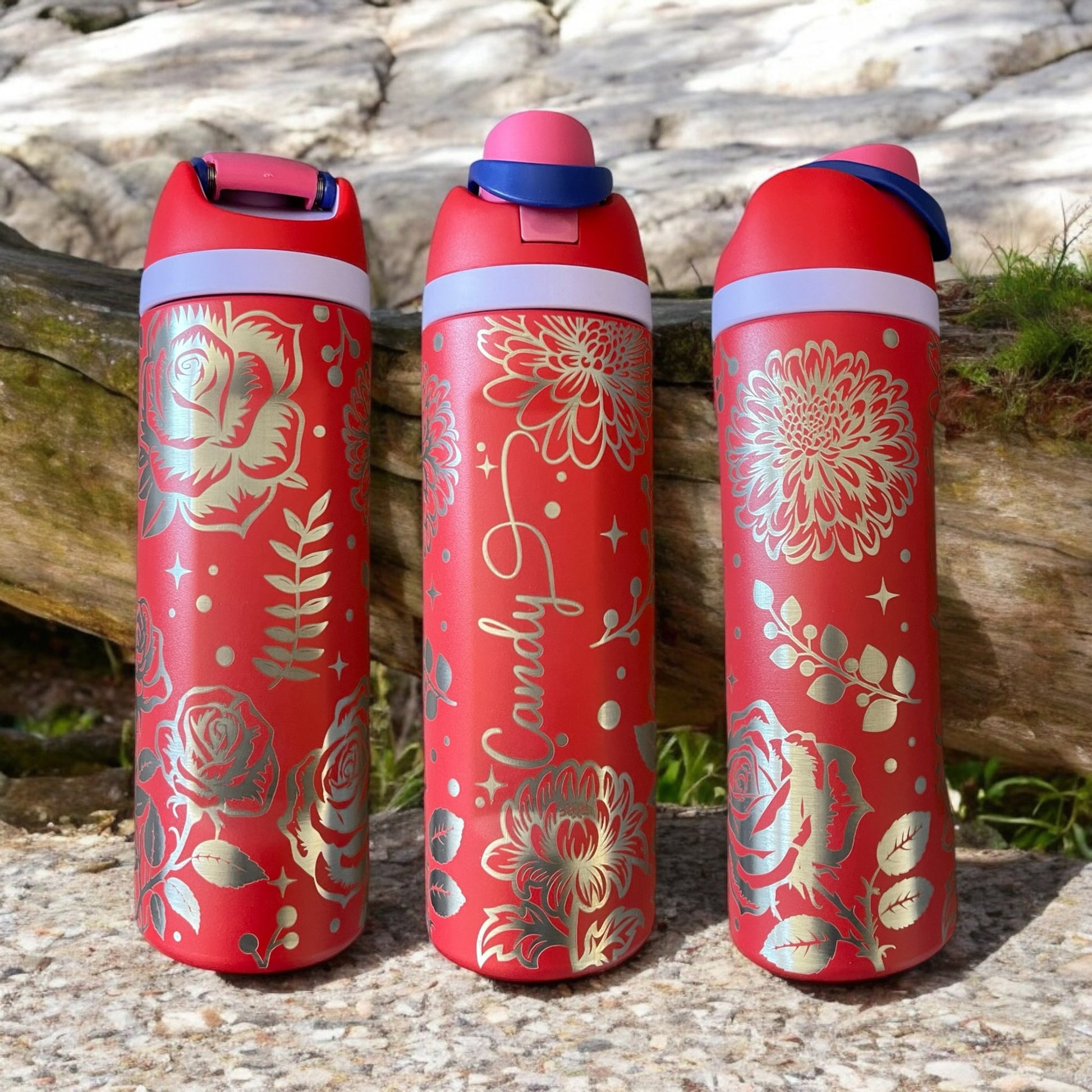 20 oz that can be used for hot or cold drinks and engraved with your custom design. These have an inner straw and small handle.