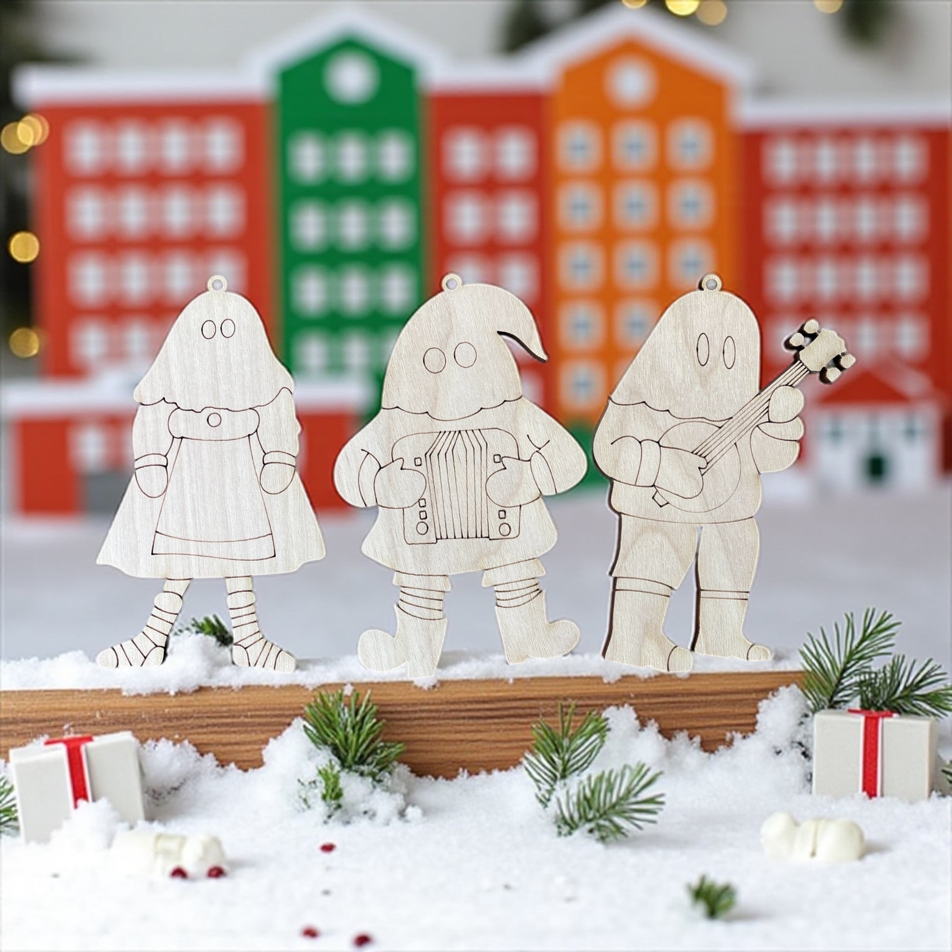 This kit comes with three 5” tall wooden ornaments , paint, brushes, string and picture to help you choose colours.